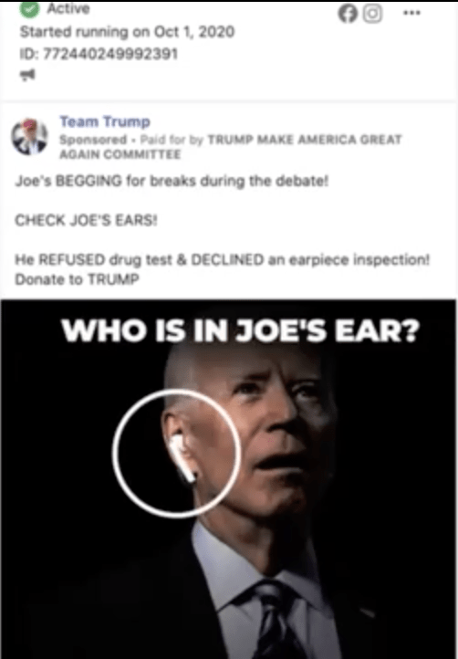 En este, usuarios y páginas de comités a favor de Trump publicaron y compartieron en Facebook una imagen en la que Joe Biden tenía un auricular en su oído durante el debate presidencial, lo cual es falso.