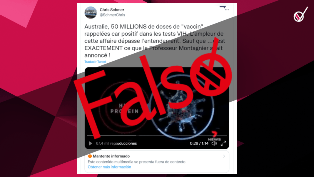 Circulan en Facebook posteos que señalan que en Australia fueron retiradas de circulación 50 millones de dosis de vacunas contra la COVID-19 porque «dieron positivo en pruebas de VIH«. «La magnitud de este caso está más allá de la comprensión. Excepto… ¡es EXACTAMENTE lo que anunció el profesor Montagnier!» (sic), agregan las publicaciones.