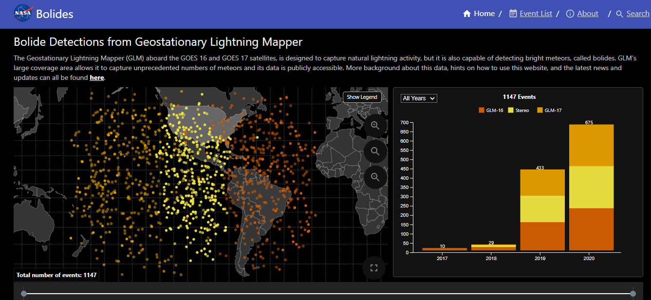 Tan solo durante el 2020, el Geostationary Lightning Mapper de la NASA (2) que puede detectar meteoros brillantes llamados bólidos, ha logrado contabilizar al menos unos 675 eventos que pudieron ser registrados por dos sistemas de teledetección de la Oficina Nacional de Administración Oceánica y Atmosférica (NOAA por sus siglas en inglés).