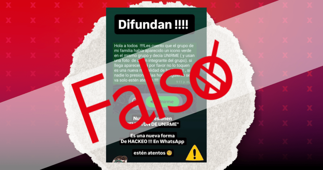 - Circula por WhatsApp una cadena que advierte no presionar el botón “UNIRME” en grupos familiares, presentándolo como una “nueva modalidad de hackeo”. Pero esto es falso.