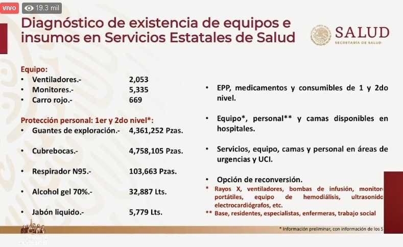 De acuerdo con el último diagnóstico de existencia de equipos e insumos en Servicios Estatales de Salud se tiene (hasta el 19 de marzo de 2020) con:
