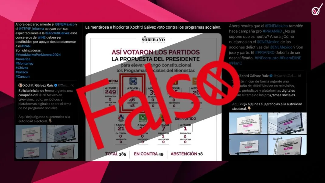 Por otro lado, han circulado publicaciones que critican a Xóchitl Gálvez por supuestamente haber dicho que buscaría eliminar los programas sociales y por haber votado en contra de protegerlos en la constitución en años anteriores, pero ambas afirmaciones son falsas.