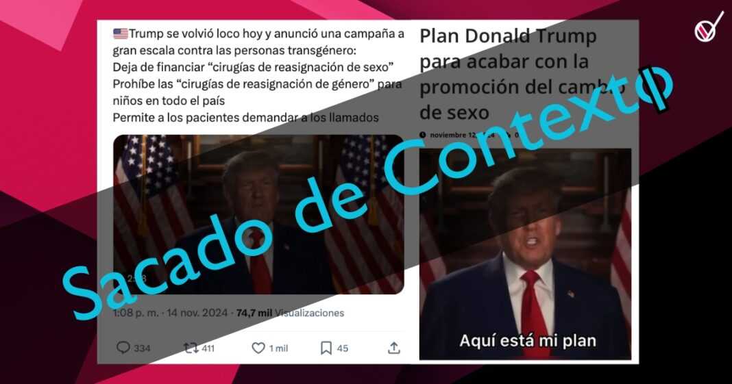 «Aquí está mi plan para detener la mutilación química, física y emocional de nuestras juventudes. El día 1 voy a revocar las políticas crueles de Joe Biden sobre lo que llaman atención afirmativa de género, ridículo, un proceso que incluye darle a los niños bloqueadores de pubertad, mutar su apariencia fisica y finalmente realizar cirugías en menores», declaró Donald Trump en un video que circula en redes sociales como X (antes Twitter), Instagram y Whatsapp.