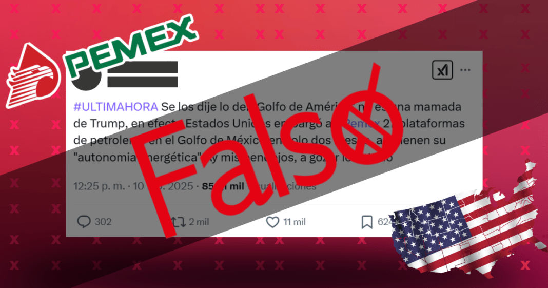 En X (antes Twitter), un post asegura que la orden ejecutiva del presidente Donald Trump de “cambiar” el nombre al Golfo de México tuvo como consecuencia el embargo de 27 plataformas petroleras de Petróleos Mexicanos (PEMEX), esto es falso.