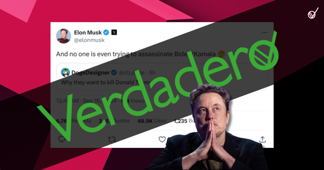 Musk publicó en X el mensaje a las 8:41 pm (hora del Este, ET) del 15 de septiembre de 2024. Aunque ya ha sido borrado, un usuario lo registró a las 9:36 pm ET en una herramienta de archivo de contenidos online. En su mensaje, el empresario respondía a otro usuario que preguntaba por qué quieren asesinar a Donald Trump, pocas horas después del intento de ataque al expresidente en Florida.