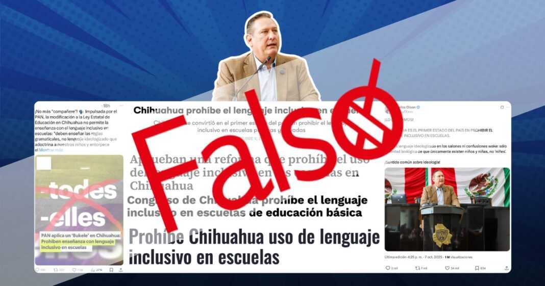 Se trata de desinformación difundida por Carlos Olson, diputado del Partido Acción Nacional (PAN), que presentó la iniciativa y celebró en redes sociales que el lenguaje inclusivo había sido “prohibido” en las escuelas de nivel básico del estado de Chihuahua.