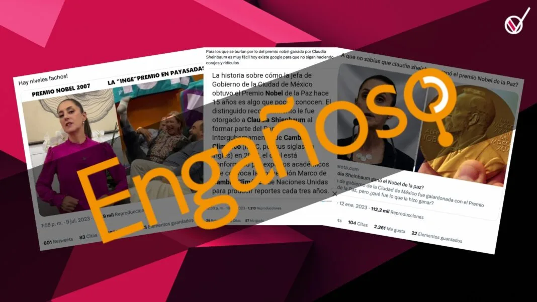 Por un lado, diversas publicaciones en Facebook, Twitter y Tik Tok afirman que la aspirante a la candidatura de Morena por la Presidencia de la República, Claudia Sheinbaum Pardo, ganó el Premio Nobel de la Paz en 2007, y por otro, algunos usuarios señalan que se trata de información falsa que se ha viralizado para promover a la corcholata.