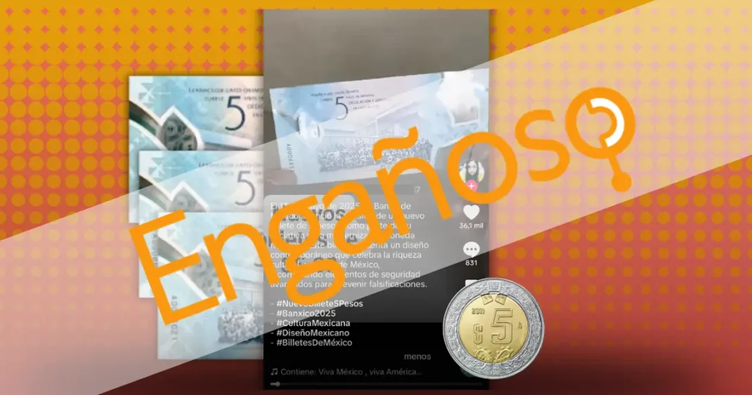 En redes sociales como Facebook y TikTok usuarios aseguran que el Banco de México anunció que pondrá en circulación un nuevo billete de 5 pesos mexicanos, pero esta información es engañosa.