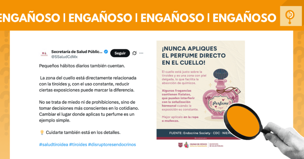 La Secretaría de Salud Pública de la Ciudad de México publicó en sus redes sociales una advertencia sobre no aplicar perfume directamente en el cuello ya que podría interferir con la señalización hormonal de la tiroides. Pero esta alerta es engañosa.