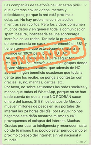 Durante la última semana en redes sociales, especialmente por medio de WhatsApp en México, han circulado varios mensajes acerca de la posibilidad de colapso en las compañías de telefonía celular por el alto tráfico que se ha presentado durante las últimas semanas en medio de la contingencia por el nuevo coronavirus. Estos mensajes son engañosos.