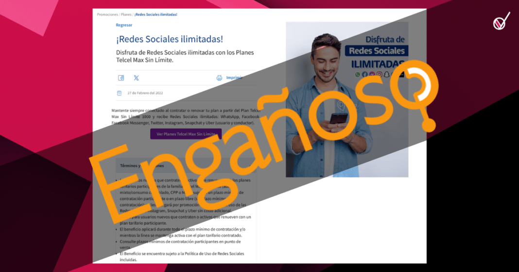 - Telcel vende varios planes con la opción de «redes sociales ilimitadas», pero esto es una estrategia de promoción engañosa, pues cada red social tiene ciertas funcionalidades que no se enlistan como ilimitadas en los paquetes de datos celulares.