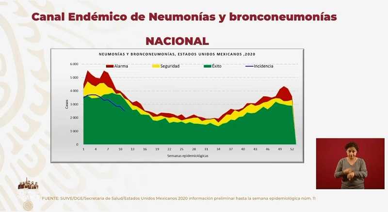 Agregó que (como este 28 de marzo) se presentarán en las próximas semanas ante la audiencia y medios, las gráficas de comportamiento de pacientes con neumonía en México, dado que es uno de los siete componentes de la vigilancia integrada de la epidemia por nuevo coronavirus. Las cuales, dijo, hasta el momento no presentan repuntes ni anormalidades.
