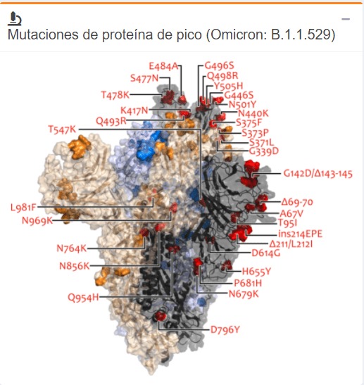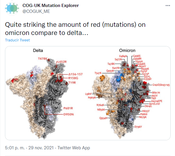 “Sabemos que es la variante con más mutaciones, con más de 50 mutaciones detectadas por encima de Delta y que 30, o poco más de 30 de estas corresponden a la proteína S que es la de espícula o “spike”, que es la parte del virus encargada del anclaje en el epitelio respiratorio y que hace que el virus entre en el cuerpo humano”, comentó.