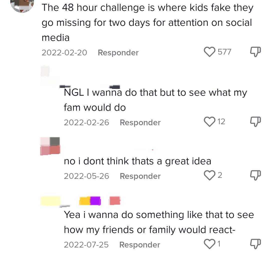 «Quiero hacerlo para ver que haría mi familia», «Quiero hacer algo como eso para ver como mis amigos o familia reaccionarían», «Mi mejor amiga lo hizo hace 4 días y ahora no se permiten las redes sociales» son algunos de los comentarios realizados a mediados de 2022 en las publicaciones sobre el reto de las 48 horas.