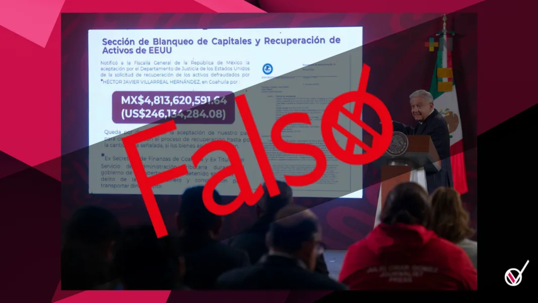 El presidente Andrés Manuel López Obrador declaró que el dinero incautado al ex tesorero de Coahuila, Javier Villarreal por parte del gobierno de Estados Unidos alcanzaba los 246 millones de dólares (unos 4.8 mil millones de pesos) y sería destinado en su totalidad al Instituto para Devolver al Pueblo lo Robado, pero la cifra del decomiso es falsa.