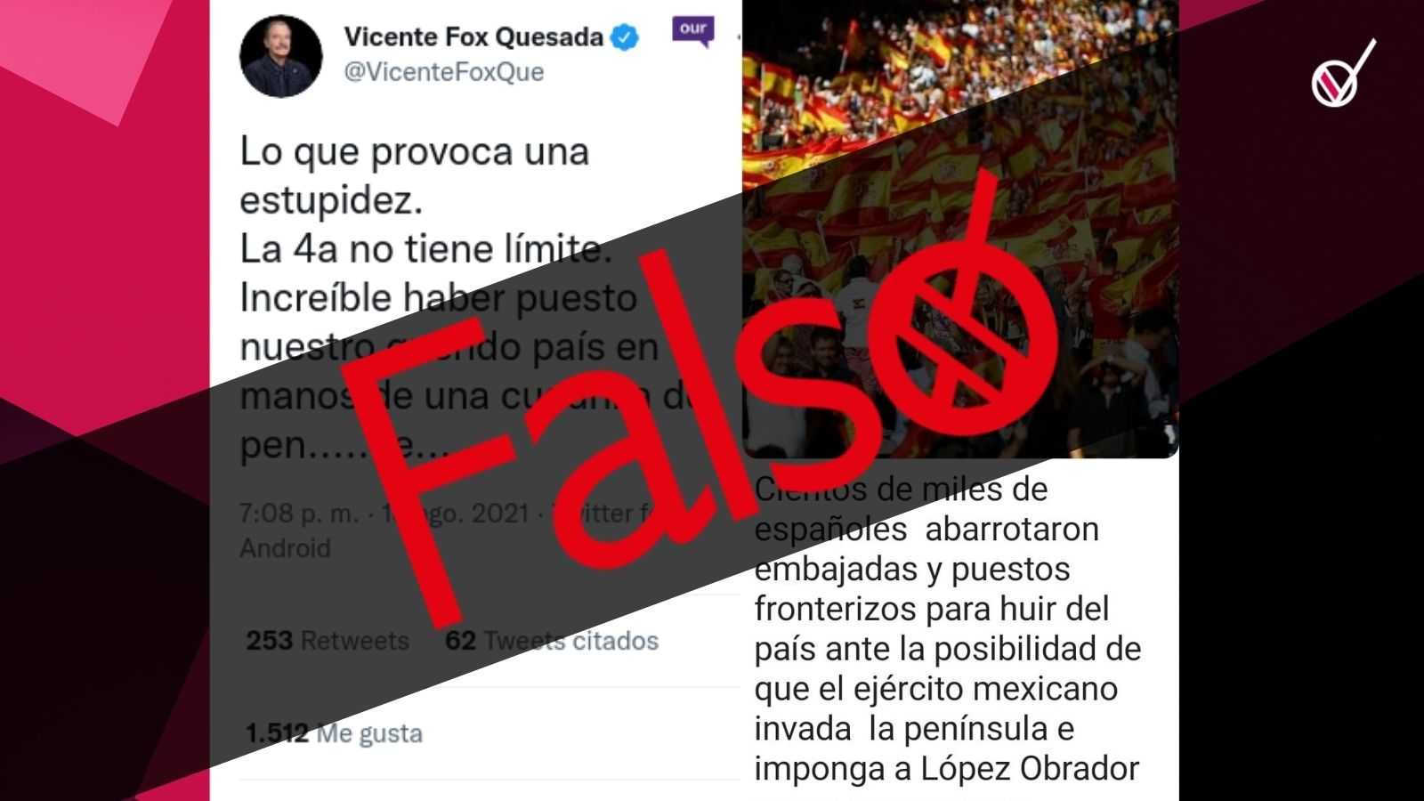 En su cuenta de Twitter, el pasado 18 de agosto el ex presidente de México, Vicente Fox Quesada, compartió una imagen de una cadena que circula en WhatsApp donde mencionan que “cientos de miles de españoles abarrotaron embajadas y puestos fronterizos para huir del país ante la posibilidad de que el ejército mexicano invada la península e imponga a López Obrador como su monarca”. Esta presunta huida es FALSA.