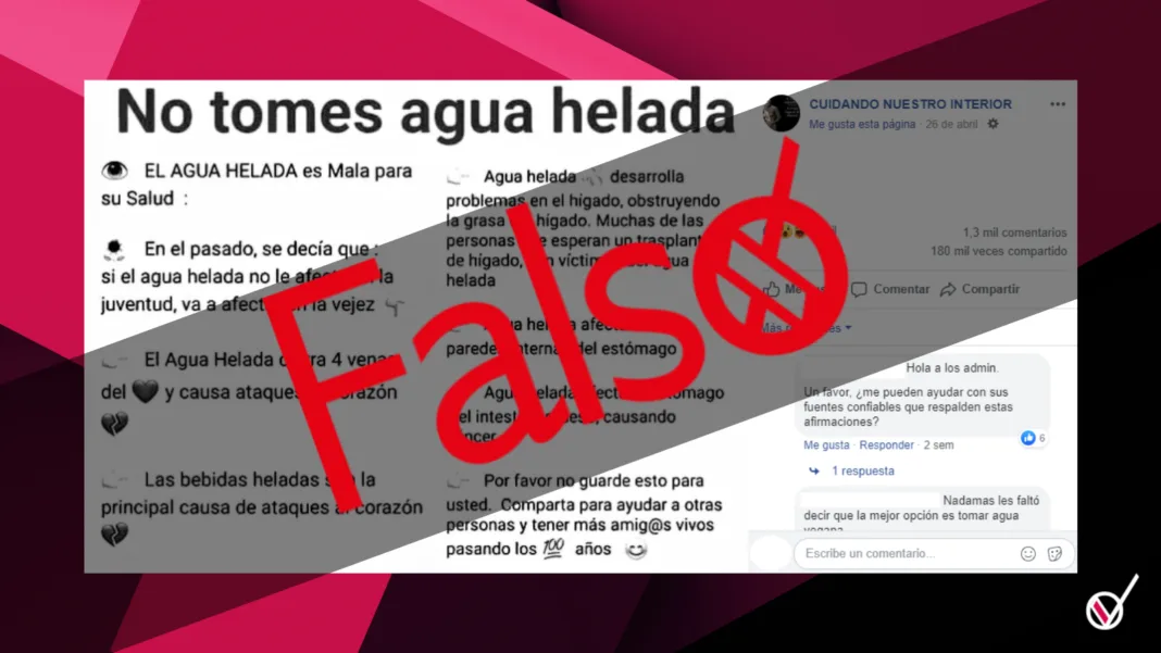 Circulan algunos contenidos en redes sociales que advierten de los supuestos riesgos de tomar agua helada. “Cierra 4 venas del corazón, obstruye la grasa del hígado, afecta a las paredes internas del estómago e intestino grueso y es la principal causa de ataques en el corazón”, indica una imagen compartida en redes sociales. Otra señala que el agua helada afecta al estómago y al intestino grueso, causando cáncer.