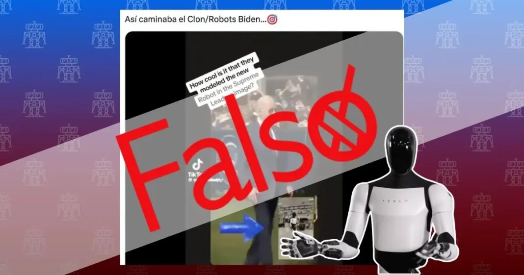 En X (antes Twitter) una cuenta que suele compartir desinformación y teorías de conspiración publicó un video en el que comparaba la forma de caminar del expresidente Joe Biden de 82 años, con el del robot humanoide Optimus que está desarrollando la empresa Tesla, como una prueba del supuesto reemplazo del político.