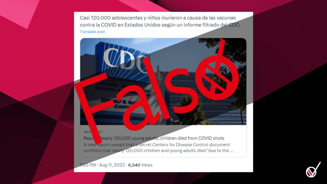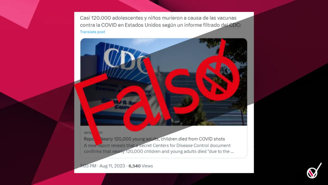 Circulan varios contenidos desinformadores que indican que “casi 120.000 adolescentes y niños murieron a causa de las vacunas contra el COVID en Estados Unidos según un informe filtrado de los CDC”.
