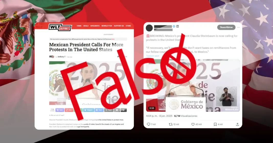 «ÚLTIMAS NOTICIAS: La presidenta de México, Claudia Sheinbaum Pardo, insta a los mexicanos a protestar en Estados Unidos. ‘Si es necesario, nos movilizaremos. No queremos impuestos sobre las remesas de nuestros compatriotas. De Estados Unidos a México’. Esto es un acto de guerra», se replicó dicho mensaje en diferentes publicaciones de X.