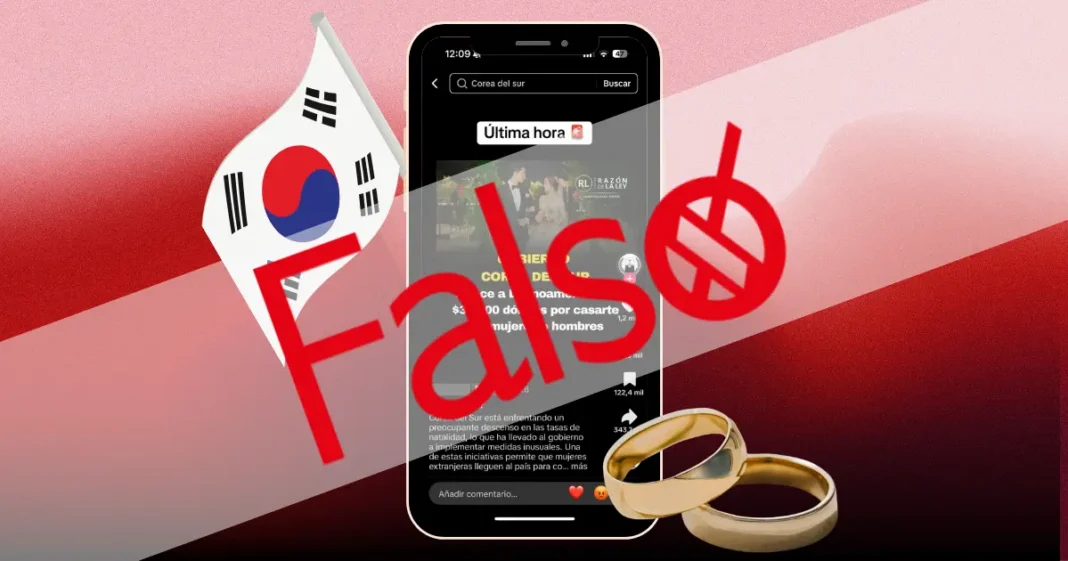 No, el gobierno de Corea del Sur no está otorgando 38 mil dólares a personas de origen latinoamericano para que contraigan matrimonio con ciudadanos coreanos, como circula en redes como TikTok y Facebook.