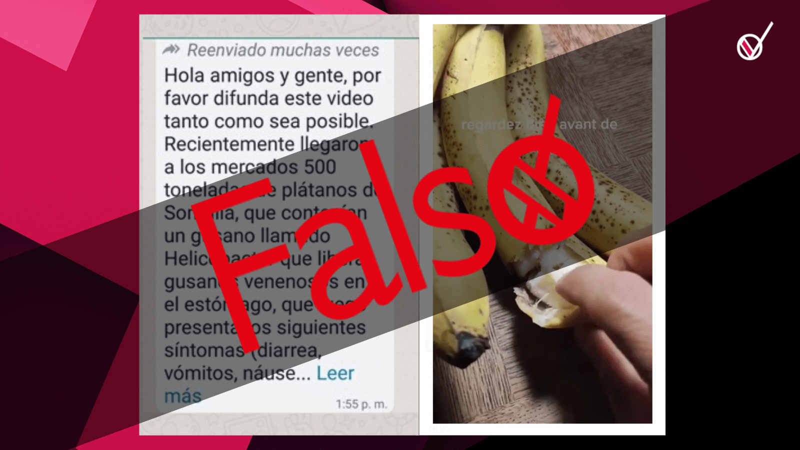 “Hola amigos y gente, por favor difundan este video tanto como sea posible. Recientemente llegaron a los mercados 500 toneladas de plátanos de Somalia, que contenían un gusano llamado Helicobacter que libera gusanos venenosos en el estómago, que luego presenta los siguientes síntomas (diarrea, vómitos, náuseas, dolor de cabeza) Por favor, absténganse de comprar y comer bananas en estos días, o si las compra, asegúrese de abrirlas por dentro”, dice el mensaje que se divulgó.