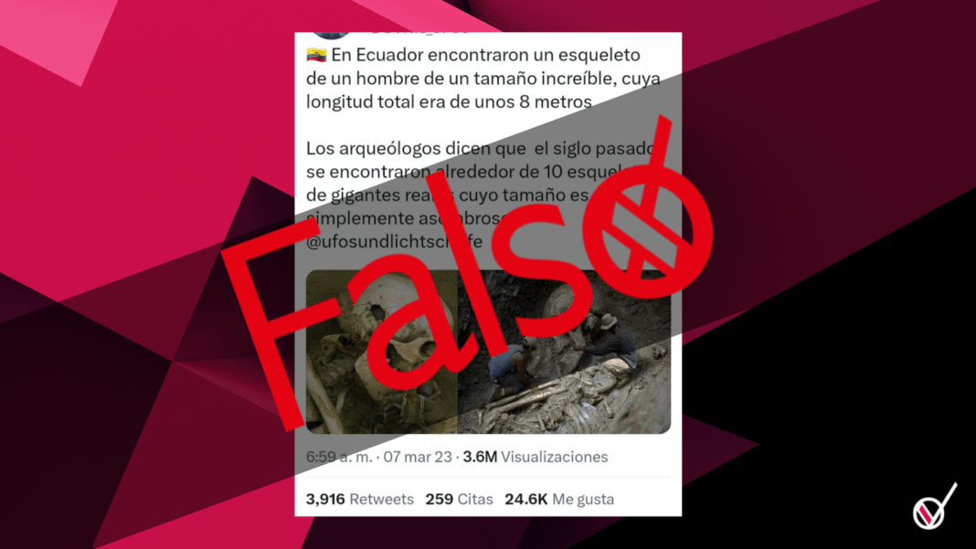 En Twitter, se popularizó el supuesto descubrimiento de un esqueleto de ocho metros de largo en Ecuador, afirmando que equipos de arqueólogos descubrieron restos óseos de 10 «gigantes» durante una excavación, esto es falso y es una desinformación que ha circulado desde hace algunos años, de manera recurrente.