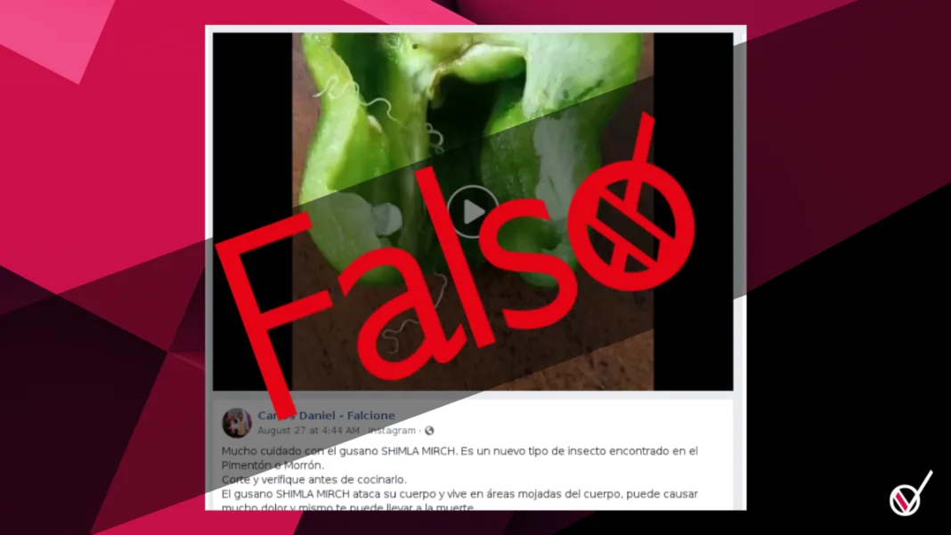 En redes sociales circula un video en el que se muestra una larva o gusano llamado Simla Mirch, el cual es mortal para los seres humanos y que supuestamente sale de un pimiento morrón verde. Pero estos datos son falsos.