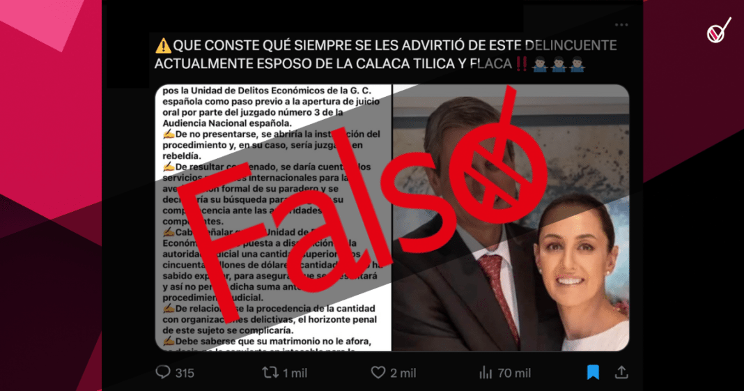 En Facebook, X y WhatsApp circula una cadena de desinformación en la que se acusa al economista Jesús María Tarriba, esposo de la presidenta Claudia Sheinbaum, de enriquecimiento ilícito y asociación con organizaciones delictivas. Sin embargo, no hay pruebas que sustenten el señalamiento.