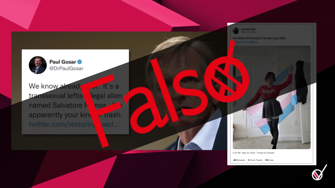 Posteriormente Paul Gosar, un político estadounidense y representante de Arizona, publicó un tuit en el que afirmaba falsamente que el pistolero que mató a más de 20 personas en una escuela de Texas era un “inmigrante ilegal transexual de izquierda”. La publicación en la red social fue eliminada, pero la versión archivada del tuit puede verse AQUÍ