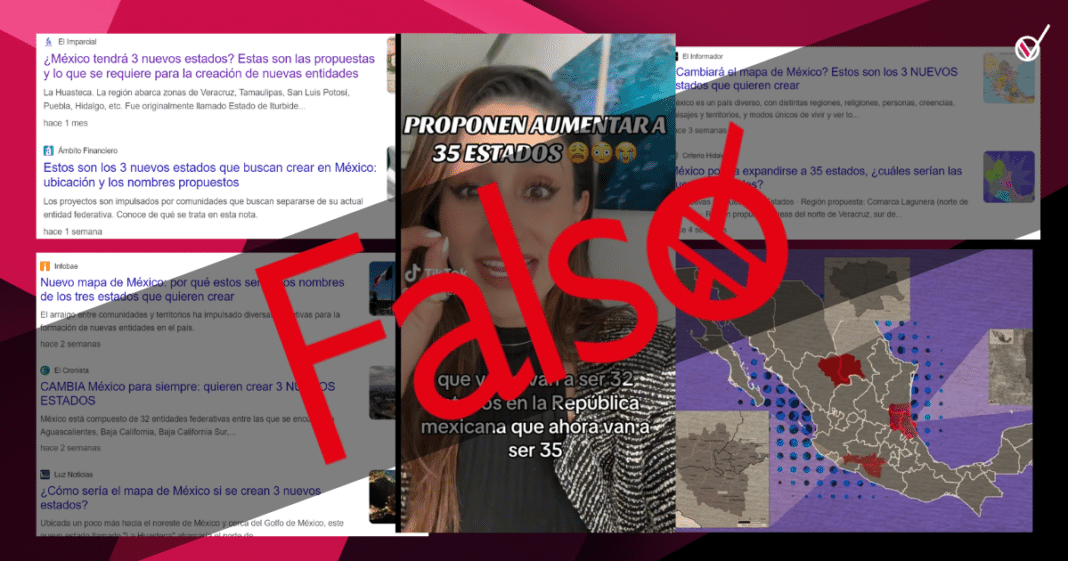 En TikTok, una mujer asegura que existe una reforma constitucional para la creación de tres nuevos estados en el país; llamados La Laguna, Huasteca y Caletano. Esto es falso, pues durante el video no se menciona fuente ni iniciativa; además, esta supuesta propuesta es inconstitucional, ya que el país es indivisible.