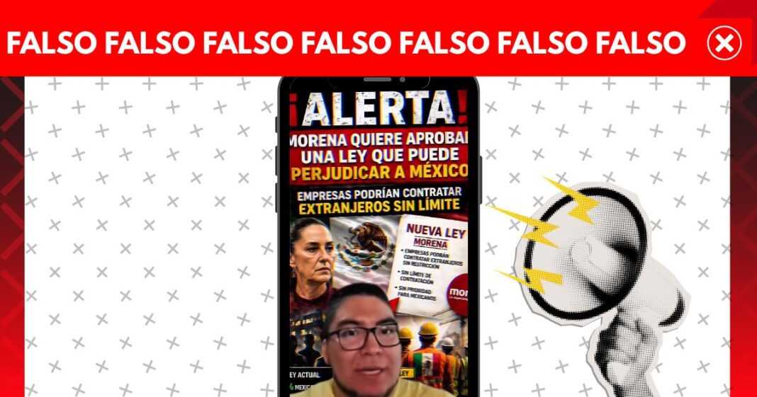 De fondo muestra una imagen en la que se lee: “Alerta. Morena quiere aprobar una ley que puede perjudicar a México. Empresas podrían contratar a extranjeros sin límite”.