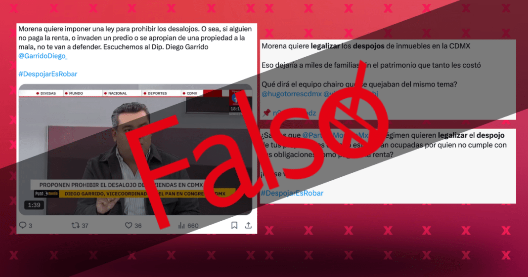 - En X se volvió tendencia el #DespojarEsRobar con el cual, políticos y usuarios afirman que hay una iniciativa de ley que “legalizaría el despojo” en la Ciudad de México. Pero es falso.