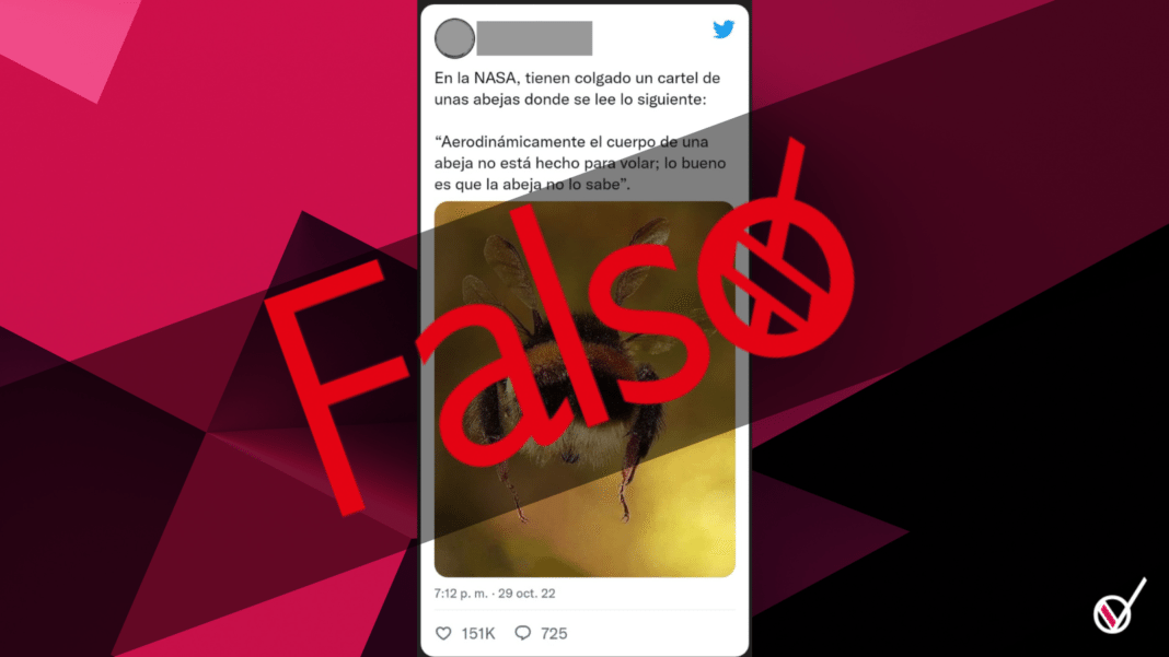 En redes sociales circula un texto acompañado de una imagen en donde se afirma que la Administración Nacional de Aeronáutica y el Espacio (NASA por sus siglas en inglés) comparte un cartel que dice: “Aerodinámicamente, el cuerpo de una abeja no está hecho para volar; lo bueno es que la abeja no lo sabe» (sic).