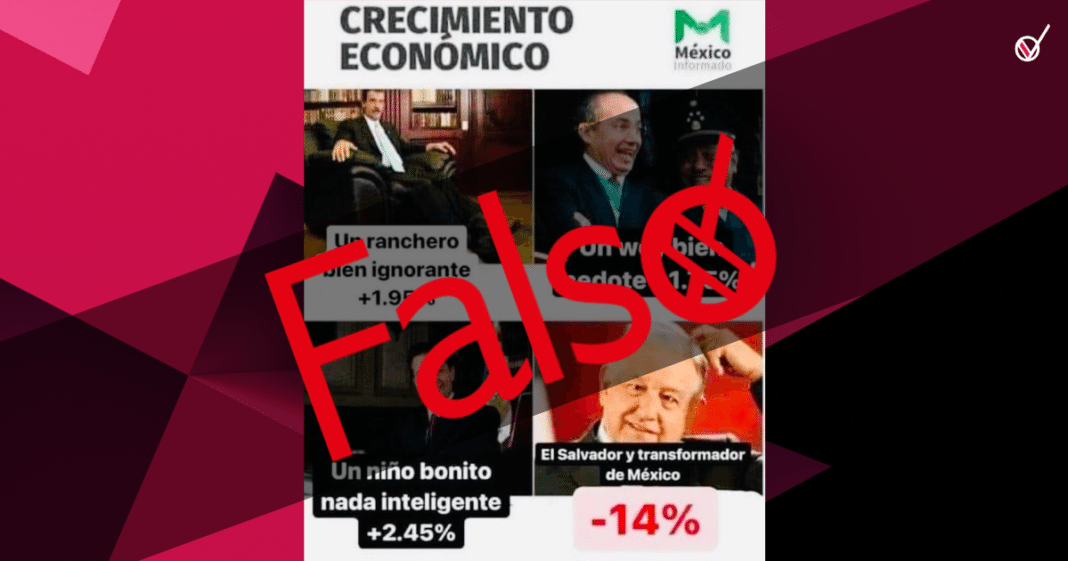 La imagen que ya cuenta con medio millón de reproducciones y se ha compartido cinco mil veces afirma que durante el gobierno de Vicente Fox, el crecimiento económico fue de 1.95, en el de Felipe Calderón fue del 1.75 y con Enrique Peña Nieto se llegó a un aumento del 2.45% en la economía. Mientras que en el sexenio de Andrés Manuel López Obrador, la economía cayó un 14 por ciento.