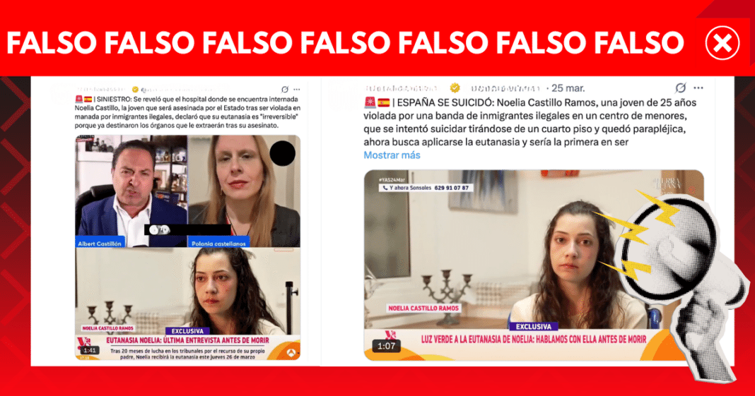 - Tras la viralización de su caso surgieron dos narrativas falsas, que Noelia fue agredida sexualmente por inmigrantes ilegales durante su paso por custodia estatal, y que no pudieron posponer la eutanasia porque sus órganos “ya estaban comprometidos”