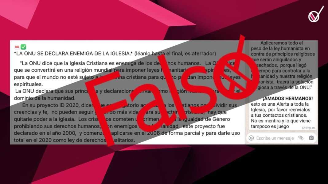 En Facebook y WhatsApp se difunde un texto donde se asegura que la Organización de las Naciones Unidas (ONU), se declaró enemiga de la iglesia cristiana y anunció que busca aniquilar los «principios religiosos» a través de su proyecto ‘ID 2020′, sin embargo, esto es falso.