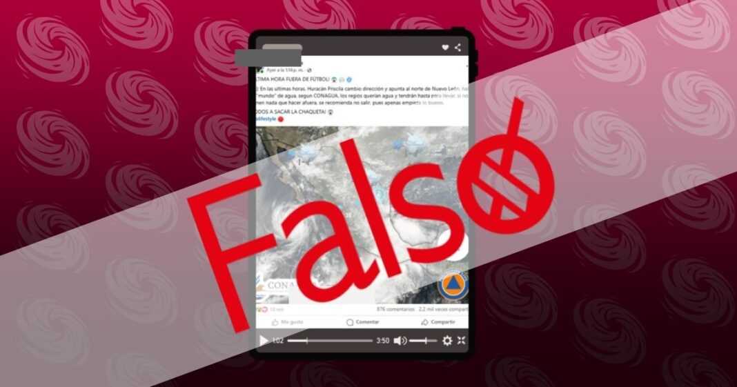 Una publicación en Facebook del pasado 8 de octubre fue compartida más de 2 mil veces y obtuvo más de 10 mil “me gusta” al asegurar que la Comisión Nacional del Agua (Conagua) advirtió que el “huracán Priscila cambio dirección y apunta al norte de Nuevo León”