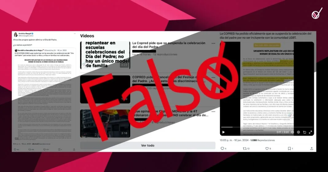 Usuarios de redes sociales como X (antes Twitter), Whatsapp, Facebook y Tik Tok replicaron mensajes y videos en los que se advierte que el Consejo para Prevenir y Eliminar la Discriminación de la Ciudad de México (COPRED) pretende eliminar la festividad del día del padre en las escuelas.