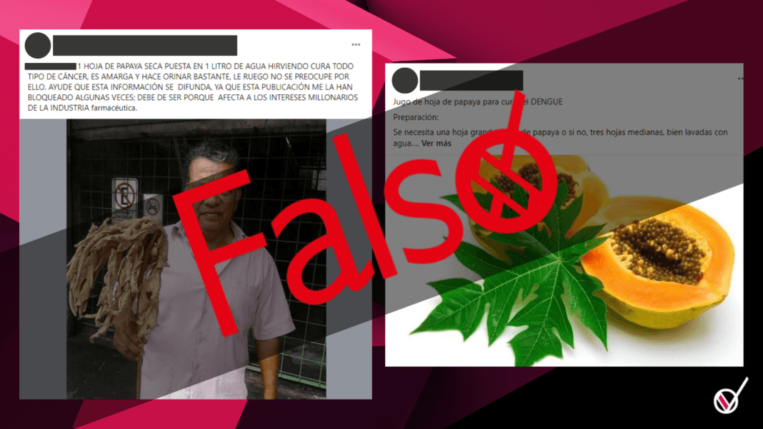 En redes sociales se están difundiendo videos que afirman que la hoja de papaya es un remedio efectivo contra el dengue o incluso una cura frente a esta enfermedad. En Facebook, un video –con más de 300 mil visualizaciones– muestra cómo preparar este supuesto remedio casero. En TikTok, otro video enseña la supuesta receta que “los farmacéuticos y los doctores no quieren que sepas”.