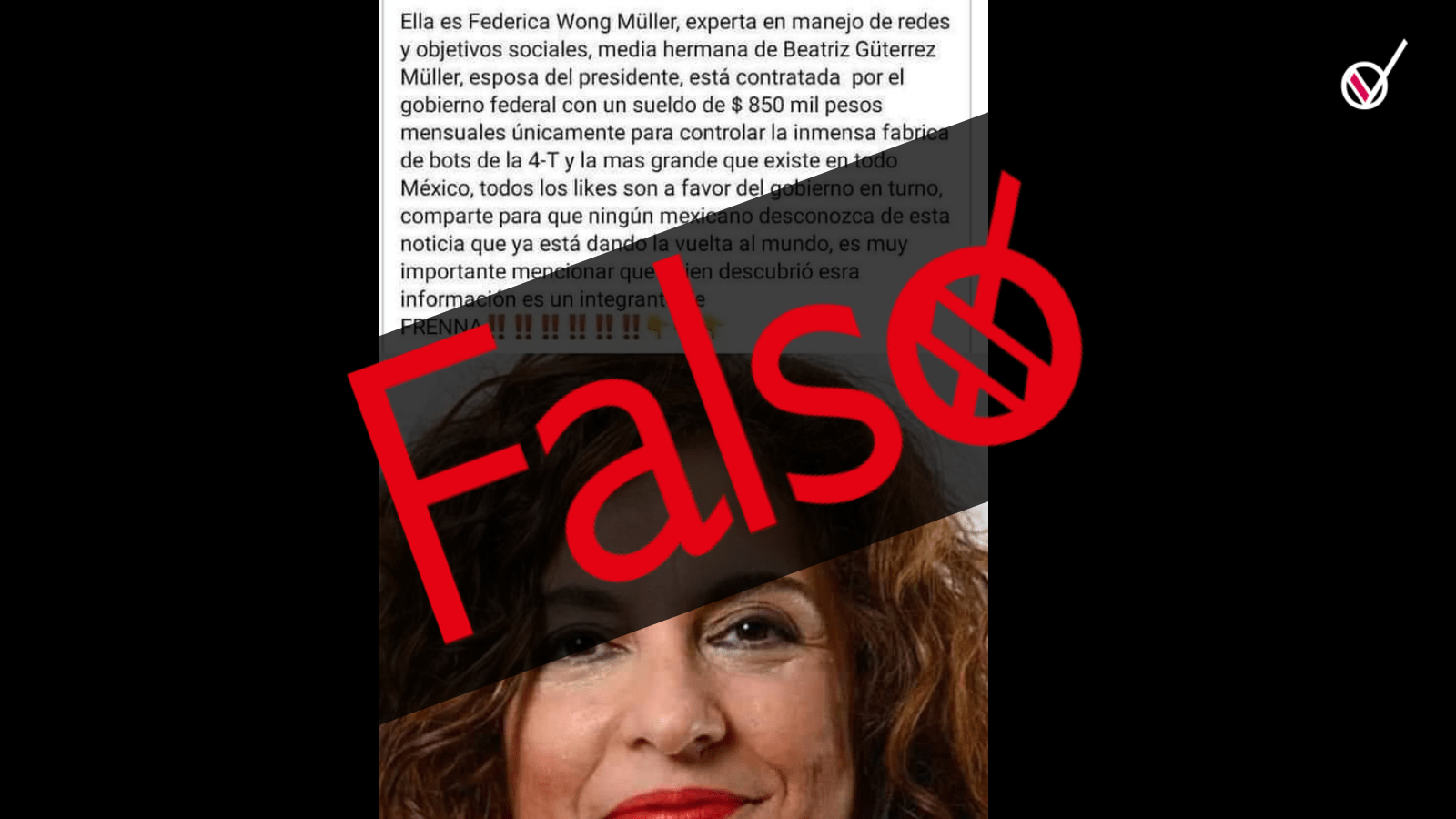 A través de nuestro canal de WhatsApp nos enviaron una imagen, donde se dice que Federica Wong Müller, (media hermana de Beatriz Gutiérrez Müller, esposa del presidente mexicano Andrés Manuel López Obrador) fue contratada por el gobierno mexicano, con un salario de 850 mil pesos mensuales para «controlar una fábrica de bots de la 4T» con el fin de promover la imagen de la actual administración, pero esto es FALSO.