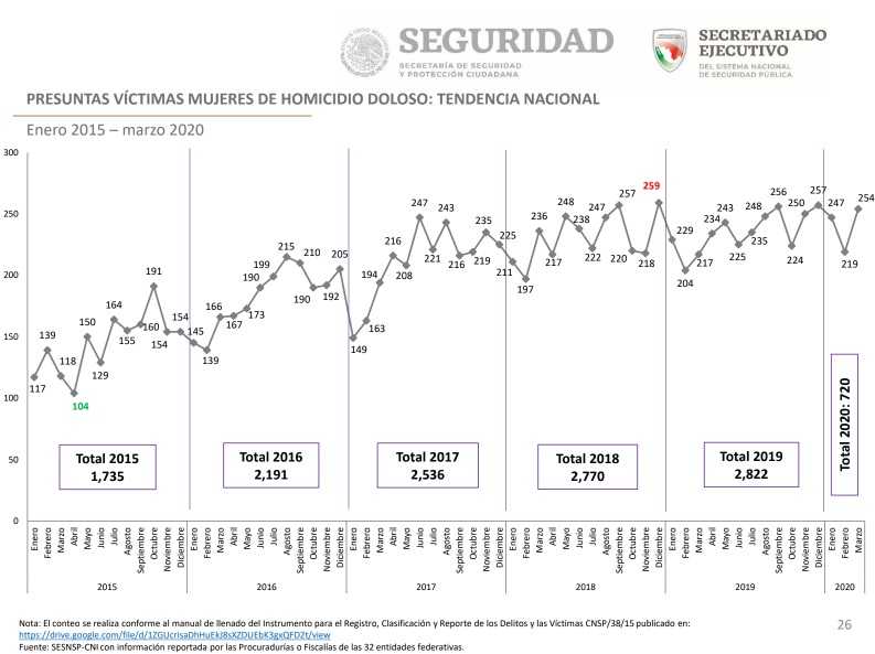 El número de presuntas víctimas mujeres de homicidio doloso, corrupción de menores, trata y de extorsión han registrado un incremento en marzo de 2020 (cuando se iniciaron las medidas para contener COVID-19), en comparación con el mismo mes de 2019, según el último informe del Secretariado Ejecutivo del Sistema Nacional de Seguridad Pública (SESNSP).