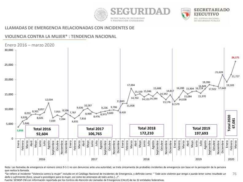 Aunque no se reportó alza en las carpetas de investigación por feminicidios y lesiones dolosas contra mujeres, las llamadas de emergencia relacionadas con incidentes de violencia contra la mujer sí aumentaron 60.7% en marzo de 2020, respecto al mes similar del año anterior.
