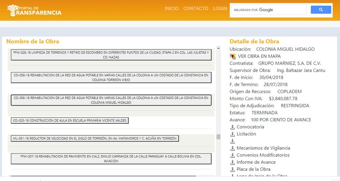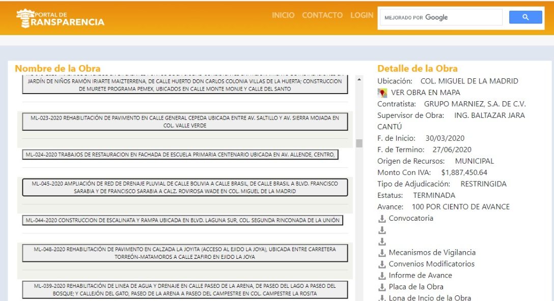 Al hacer una revisión en el portal de transparencia del municipio, en la sección de obra pública, dimos con que a esta empresa se le asignaron, desde 2018, nueve contratos para, principalmente, ofrecer obras relacionadas con construcción y rehabilitación de drenajes.