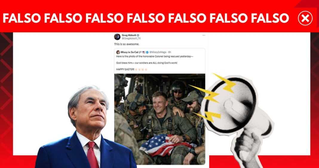 El gobernador de Texas, el republicano Greg Abbott, reposteó el 5 de abril de 2026 en su cuenta de X (antes Twitter) una imagen que supuestamente muestra al piloto estadounidense que fue rescatado ese día en Irán luego de que su avión fuera derribado en la madrugada del 3 de abril de 2026. Pero hay un problema: la imagen no es una foto real del piloto rescatado, sino que fue generada con inteligencia artificial (IA).
