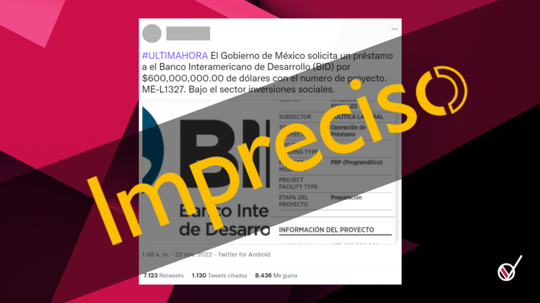 En Twitter y otras redes sociales se viralizó una noticia que asegura que el gobierno de México solicitó un préstamo de 600 millones de dólares al Banco Interamericano de Desarrollo (BID), sin embargo, esto es impreciso.