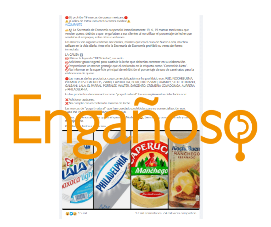 En una publicación de Facebook, un periodista agregó la fotografía de un queso crema Philadelphia y no del queso tipo americano de la misma marca que se había ordenado suspender. Este post se ha compartido 2 mil 400 ocasiones y se ha comentado 1,200 veces.