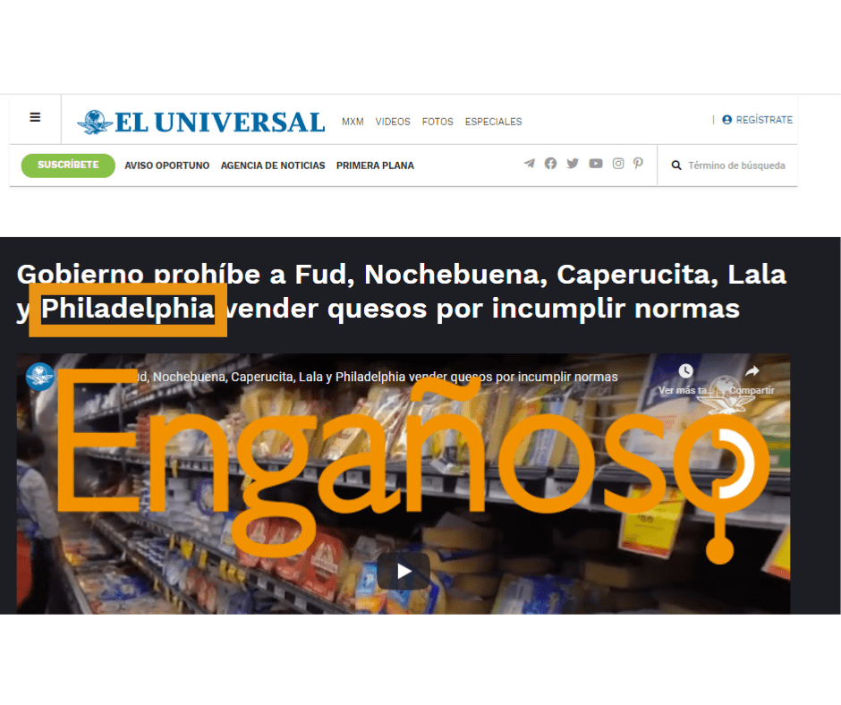 Es engañoso que la Secretaría de Economía de México haya ordenado suspender la comercialización de los quesos marca Philadelphia por incumplir diversas normas como algunos medios de comunicación y publicaciones virales lo han señalado.