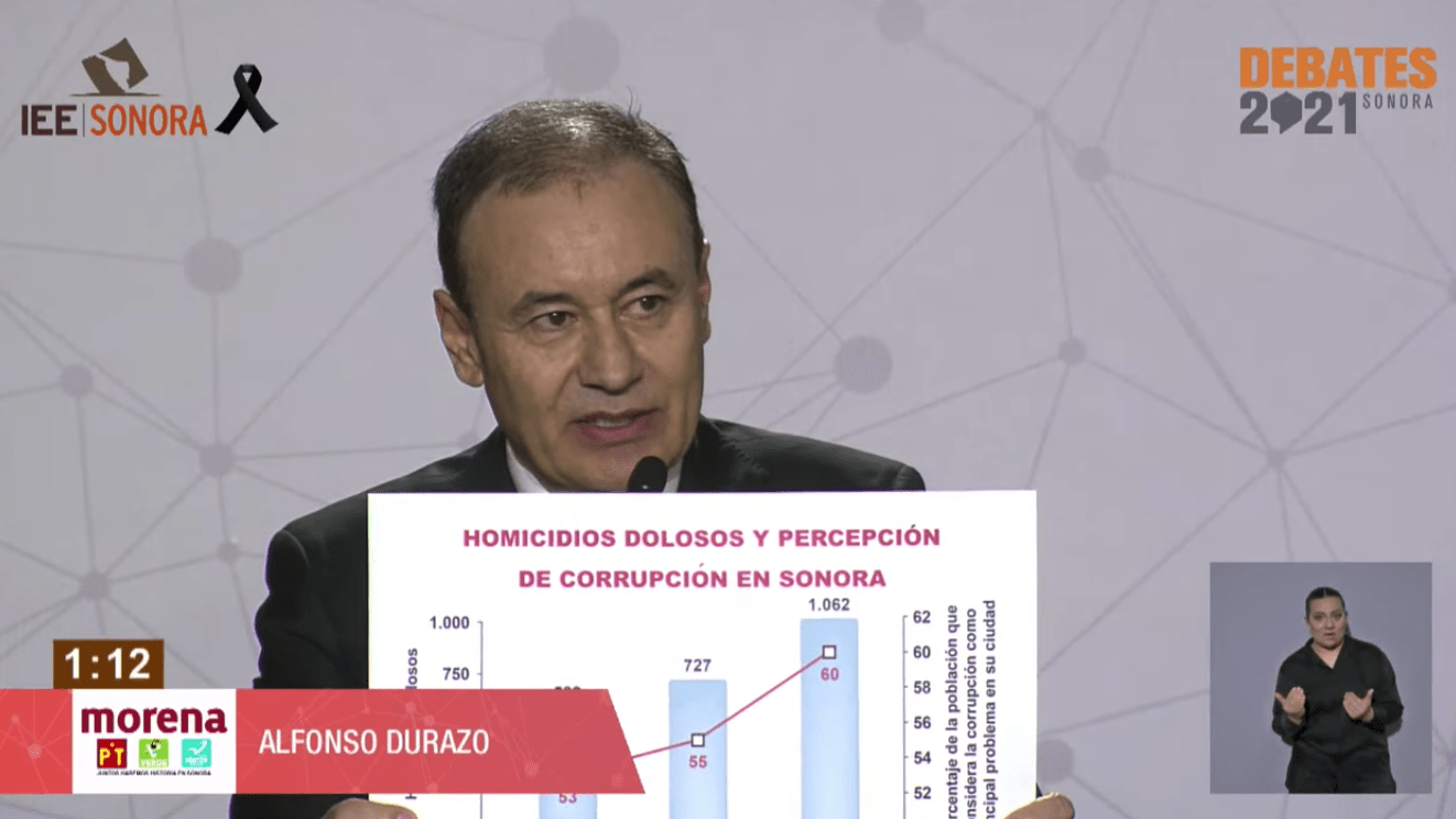 “No es del 2018 al 2021, sino del 2015 al 2021”, contestó Durazo en su siguiente intervención. “Aquí vemos una gráfica sobre la tendencia creciente de la inseguridad desde el 2015, precisamente cuando inició la actual administración estatal”, agregó el abanderado común de Morena, Partido del Trabajo, Partido Verde y Nueva Alianza.