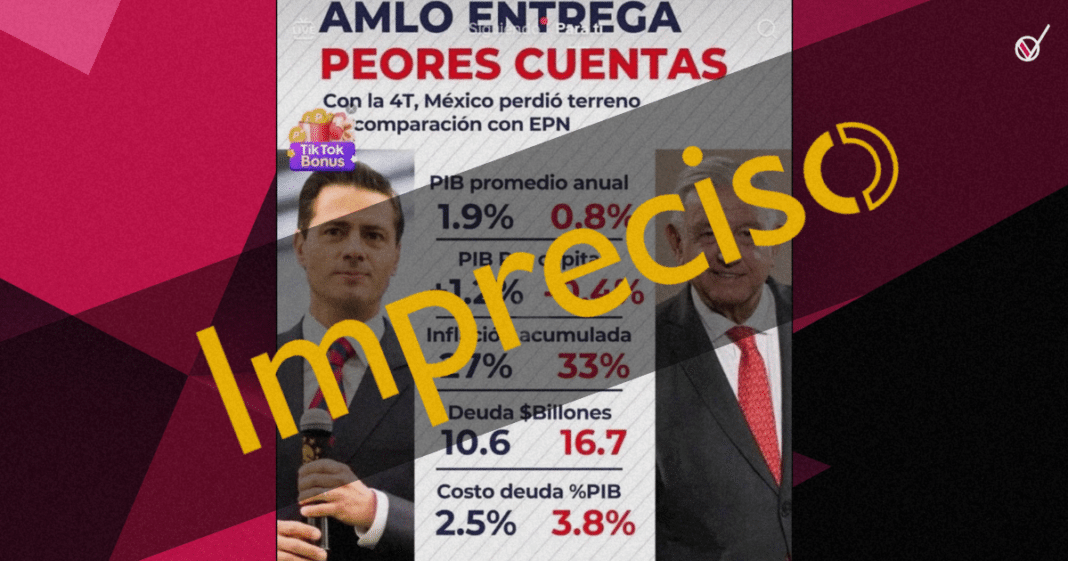 En redes sociales como X (antes Twitter) y TikTok circula una imagen en la que se comparan los cierres de indicadores económicos de los sexenios de Enrique Peña Nieto y Andrés Manuel López Obrador.